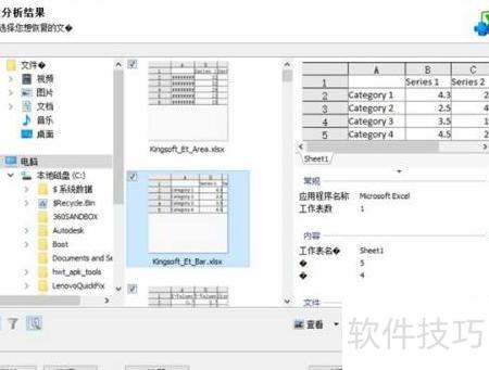 6、 点击缩略图查看Excel详细信息,勾选需恢复的文件,进入保存窗口后选择存储位置,如磁盘等目标路径完成保存操作。