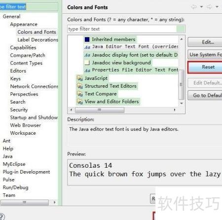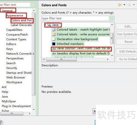 3、 在弹出的首选项窗口中,依次展开常规→外观→颜色与字体,然后在右侧颜色与字体列表中定位到Java选项,点击展开后找到Java编辑器文本字体,双击该条目即可进行字体设置更改。此操作常用于调整代码编辑界面的显示效果,提升编程时的视觉体验。