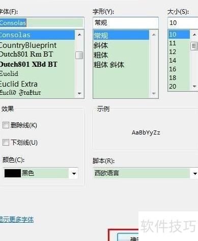 4、 打开字体设置窗口,选择所需字体、大小和颜色,确认设置后点击确定即可。