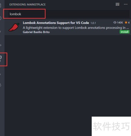 2、 点击左侧工具栏的扩展按钮,在弹出的搜索框中输入关键词Lombok Annotations Support for VS Code进行查找并安装该插件,以便在开发过程中获得对Lombok注解的更好支持,提升编码效率与体验。