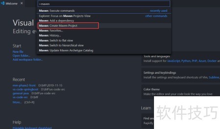 2、 按下Ctrl+Shift+P,输入maven进行搜索,选择创建Maven项目选项,按提示操作即可完成新建。