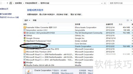 2、 在程序和功能中,找到你最近安装的Java版本。