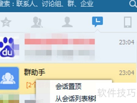 6、 在群助手上点击右键,从菜单中选择置顶功能,即可将其固定在群聊顶部,避免因发言较少而难以找到。