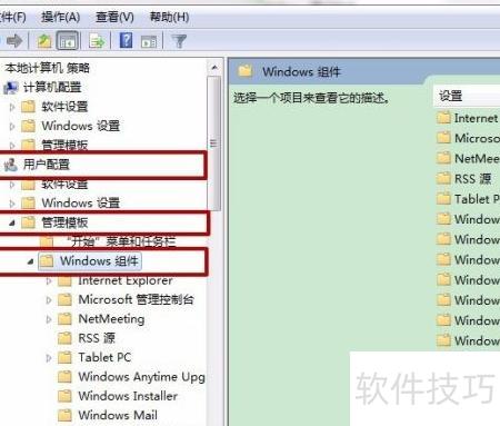 9、 依次点击展开用户配置、管理模板、Windows组件。