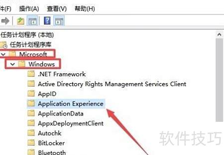 5、 打开任务计划程序后,依次展开任务计划程序库下的Microsoft和Windows选项,随后在列表中查找并定位到Application Experience项即可完成操作。