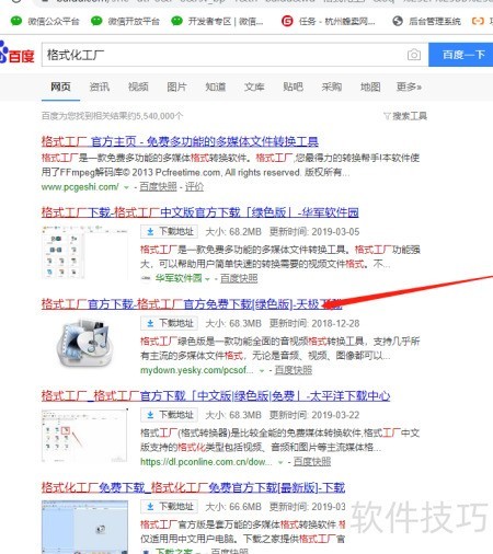 1、 搜索格式工厂,我习惯不在官网下载,通常选择其他站点。下载时注意文件大小,低于10M的建议放弃,更换链接重试,具体方式依个人偏好而定。