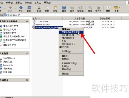 15、 插入U盘后找到Windows XP的ISO镜像文件,右键点击该文件并选择加载到虚拟光驱即可。
