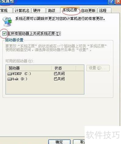 4、 右键点击我的电脑,进入属性,选择高级选项,在系统还原页面中关闭所有驱动器的还原功能,因XP系统还原作用有限,可直接禁用。