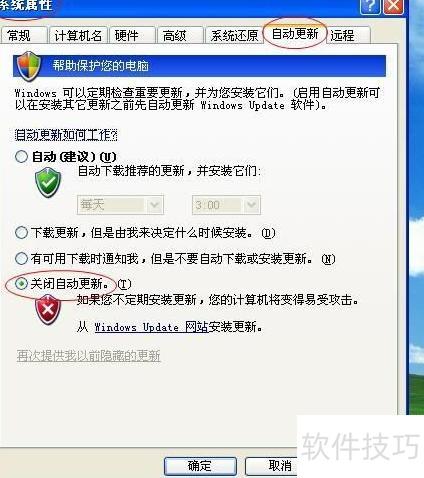 5、 右键点击我的电脑,进入属性,选择高级选项,在自动更新页面中将其关闭。多数用户使用的并非正版系统,因此建议手动关闭此功能以避免不必要的麻烦。
