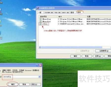 6、 按下开始菜单中的运行,输入MSCONFIG,进入系统配置界面。在启动选项卡中,除CTFMON(输入法)外,其余项目均可取消勾选。这些启动项大多非系统必需,即便关闭也不会影响基本使用。实际上,即使不启动输入法程序,仍可正常输入文字,唯一区别是任务栏不会显示输入法切换图标。