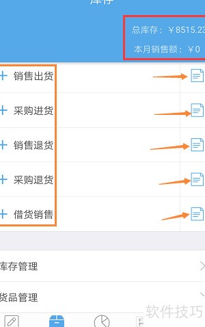 2、 红色区域显示总库存与本月销售额的统计情况,橙色区域为库存基础操作功能,橙色箭头指向历史单据查询。库存管理模块包含库存明细、仓库设置、初始数据录入、调拨、盘点及价格调整等功能;货品管理则用于维护商品的基本资料信息。