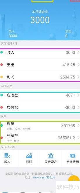 1、 黄色区域显示账本名称,可在此修改账本、新增账本或设置用户权限;红色区域为设置,支持配置部门、职员、收支类别及汇率;橙色部分展示本月现金流量;枚红色区域呈现本月收入支出与利润,点击可查看详细数据;蓝色区域显示应收款与应付款,进入可查询明细;绿色区域为账户资金与资产,提供详细资金状况;页面中黄色加号按钮为记账功能入口,方便快速录入财务信息。