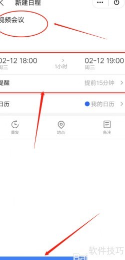 4、 在首个输入框填写日程名称,第二项选择具体时间段,第三项可设定微信或QQ提醒功能,以便及时获知即将开始的日程,所有设置完成后点击按钮完成操作。