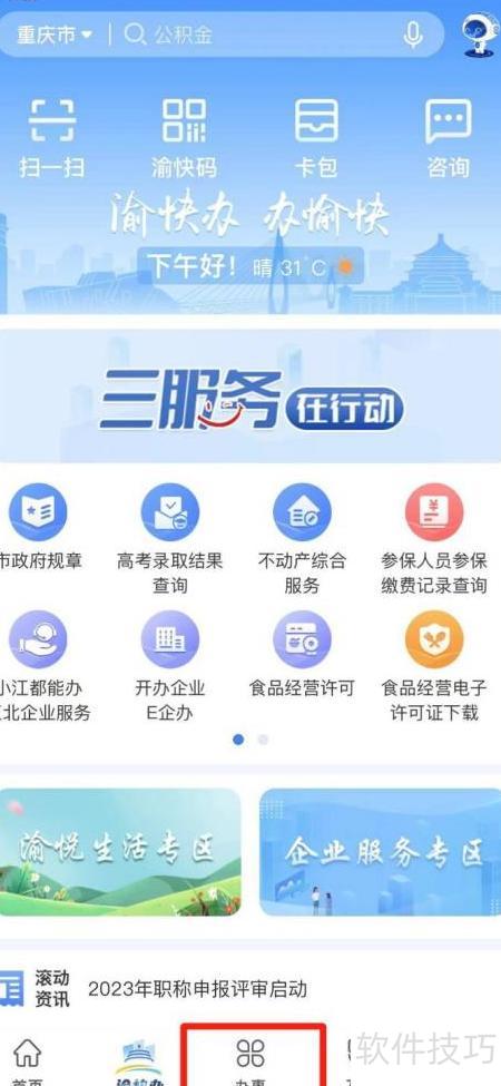 1、 打开重庆市政府APP,进入办事页面。