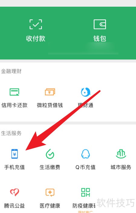 3、 进入支付页面,选择生活服务中的手机充值功能。