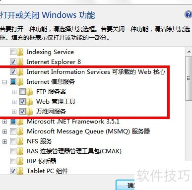 3、 第三步需特别留意,务必勾选红框内的三个选项:Internet Information Services 可承载的 Web 核心、Web 管理工具以及万维网服务。关于Web 管理工具是否必须,目前尚不完全确定,但为确保完整配置,建议一并选中。操作时,若已选择其上级目录Internet 信息服务,仍需逐一确认其下各子项均被明确勾选。只有当每个子项前均显示为完整的√符号才算有效,若显示为■则表示未完全选中,不符合要求。请务必保证所有相关子项都呈现√状态,整体效果应与步骤三所示图例一致。完成选择后点击确定,系统将弹出后续提示窗口,继续进行下一步操作即可。