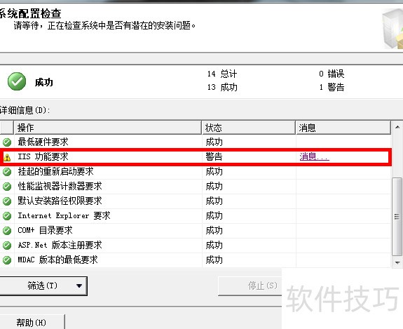 4、 若未开启IIS功能,后续安装SQL Server时将出现所示的提示界面。
