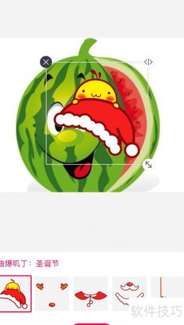 2、 当图片显示在软件页面时,下方会有一排菜单,点击贴纸选项,进入后查找圣诞帽即...