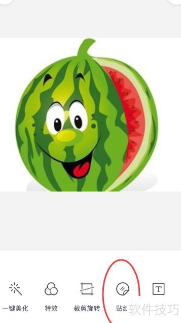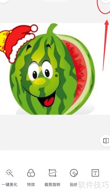 2、 当图片显示在软件页面时,下方会有一排菜单,点击贴纸选项,进入后查找圣诞帽即可。