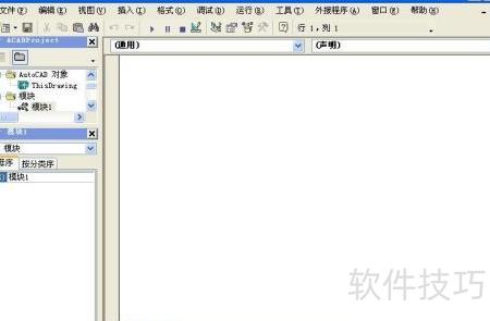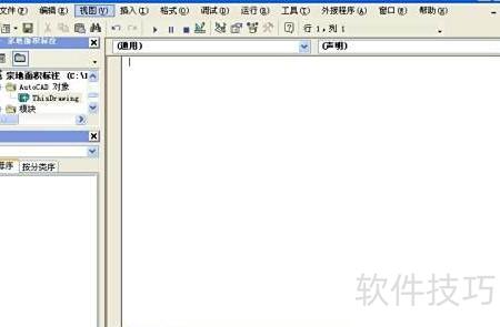 7、 双击工程窗口中AutoCAD对象的ThisDrawing,右侧代码窗口将变为空白状态。
