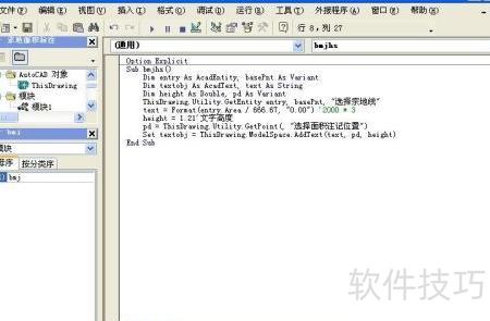 1、 启动CASS7.1后,在命令行输入vbaide并回车,即可进入VBA编程界面。