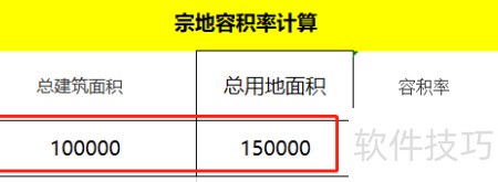 3、 在第二行输入总建筑面积、总用地面积、容积率作为标题内容,所示。