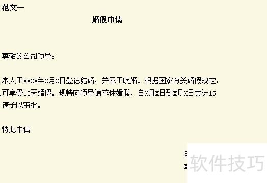 8、 本人于XXXX年X月X日登记结婚,属晚婚,按规定可享受X天婚假。现申请自X月X日至X月X日休假,共计X天,恳请批准。随附结婚证复印件。