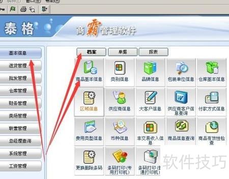 1、 打开泰格商霸软件后台,依次点击基本信息、档案,进入商品基本信息页面。