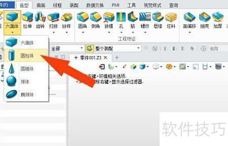2、 在零件制作界面,用鼠标左键点击工具栏里的圆柱体模型图标,所示。