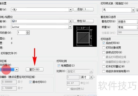 8、 选择打印范围为窗口,点击右侧按钮,在图纸中手动框选需打印的区域即可。