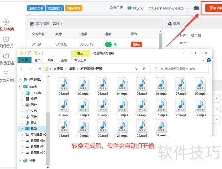 8、 点击按钮,启动软件转换功能,待音频文件全部转换完毕,系统将自动打开输出文件夹。