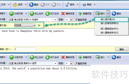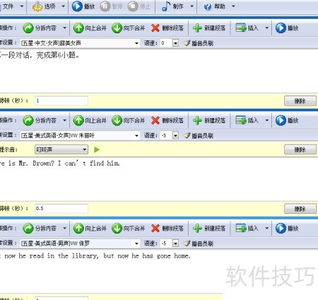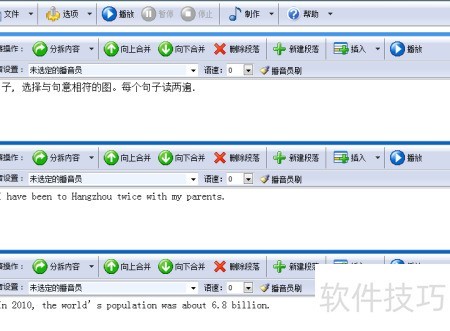 4、 英语听力制作专家拥有完全可视化的操作界面,操作极为简便,用户无需专门学习便能快速掌握。其核心功能在于为不同语言内容匹配相应的语音角色。例如,中文部分可选择中文发音人,英文部分则选用英文发音人;若涉及对话场景,男性角色由英文男声朗读,女性角色则切换为英文女声。整个制作过程直观清晰,主要步骤是将文本按语句或段落进行划分,软件称之为分拆内容。系统支持智能自动分割,只需选中一段文字,点击鼠标右键,选择自动分拆本段落内容,程序便会根据语义和标点自动完成切分。随后,用户只需为各个片段指定对应的发音人即可完成设置。整个流程简洁高效,极大降低了听力材料的制作门槛,即便是初学者也能在短时间内独立完成高质量的双语听力内容编排与生成,适用于教学、自学等多种场景。