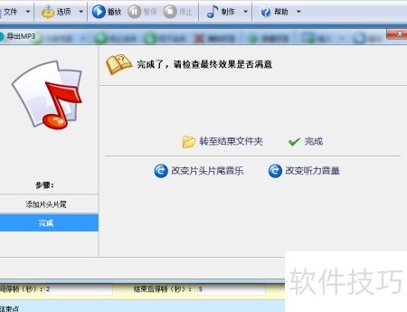 17、 导出时间根据听力内容的长度大约需要3到5分钟,请您耐心等候。完成后,点击转至结果文件夹按钮,系统会自动打开存放最终MP3文件的目录。您可使用任意MP3播放器播放文件,检查效果。如需更换片头音乐或调整音量放大倍数,可点击相应选项进行修改。若对结果满意,直接点击完成即可关闭当前导出界面。