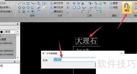 4、 如需编辑文字内容,可切换至编辑器选项卡,启用捕捉功能后,双击目标文字即可弹出文字编辑窗口,所示,随后便可在此界面中完成对文字的修改与调整操作。