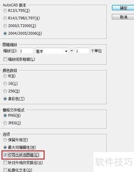 5、 在弹出的DXF/DWG选项窗口中,选择所需的AutoCAD版本,并勾选仅导出所选图稿。若需导出整页内容,则可跳过此步骤且无需勾选该选项,具体操作所示。