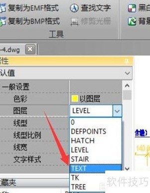 3、 在图层窗口打开后,可对当前DWG图纸中的实体属性进行调整,例如先修改文字的颜色,操作所示。