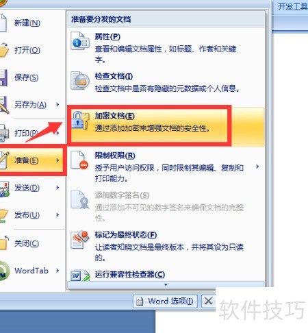 4、 依次选择准备和加密文档选项。