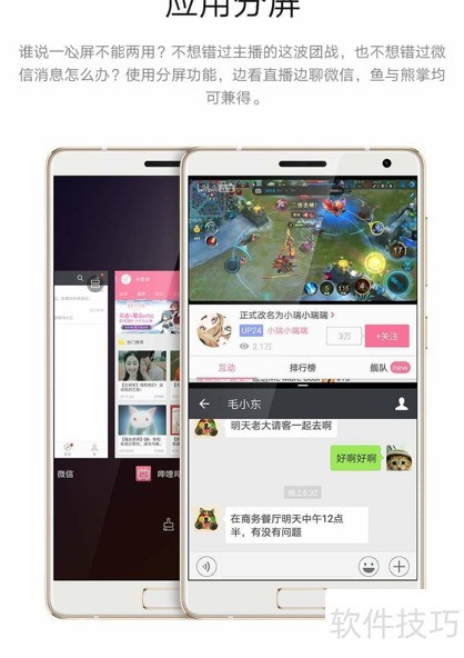 3、 ZUI 2.5 搭载安卓7.0,新增应用分屏功能,轻松实现一边微信聊天一边观看直播或视频,大幅提升多任务处理效率,让一屏同时运行双应用成为现实。