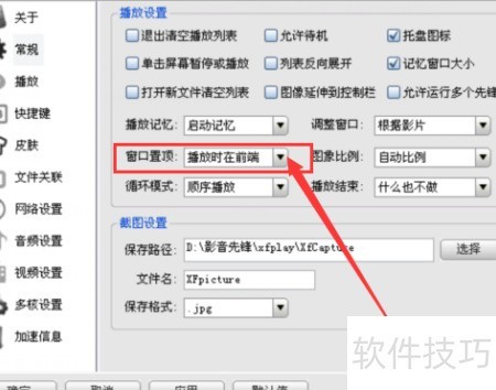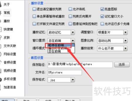 3、 开启窗口置顶功能后,默认设置为播放时显示在前端。点击选项后方的小三角,展开多个选择,从中选取取消前端即可完成设置。