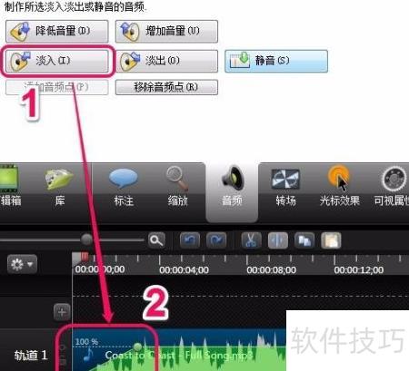 8、 点击淡入按钮后,轨道图示中声音素材呈现缓慢上升的波形,显示出音量逐渐增强的淡入效果。