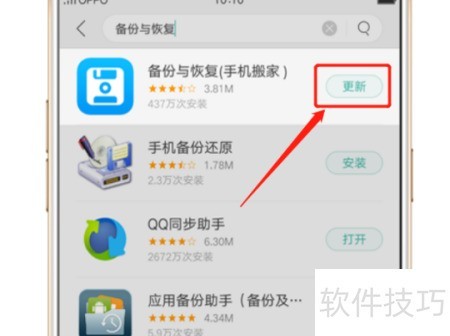 1、 在应用商店中搜索备份与恢复(手机搬家),找到后点击更新按钮完成升级操作。