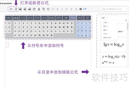 2、 新建公式时,可通过键盘输入数字或字母,或用鼠标点击所需符号进行组合。若需导入已有公式,可点击顶部打开按钮,选择相应文件导入后即可进行编辑操作。