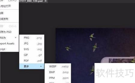 5、 编辑完图片后,点击文件菜单中的导出为,选择所需格式,若需保存为JPG,直接选中该格式即可完成保存。