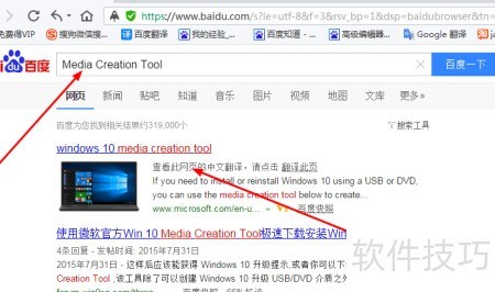 1、 打开浏览器,搜索百度,查找 Media Creation Tool 工具并下载使用。