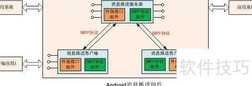 36、 Android消息推送系统包含服务端与客户端两部分,二者均包含XMPP协议模块和外部接口模块。XMPP协议模块负责维护服务端与Android设备间的连接及消息传输,确保通信稳定可靠;外部接口模块则用于接收来自应用系统或客户端的指令,并将收到的通知信息转发给相应的应用系统,实现消息的高效分发与交互,保障推送功能的完整运行。