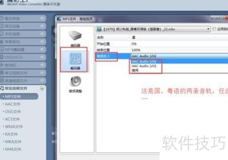 8、 点击解码器,选择音轨流0,此为双语视频中的国语音轨。如需提取粤语,请选择第二条音轨即可。