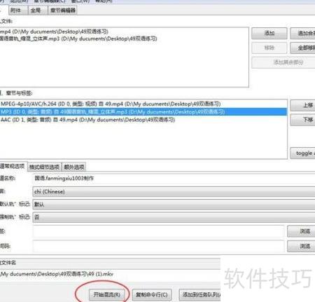 23、 启动mkvmerge GUI软件,将49.mp4文件与之前导出的国语MP3音频文件拖入界面。为每个音轨准确填写相关信息,例如制作者姓名等详细信息。若希望国语优先播放,可将国语音轨顺序置于粤语音轨上方。确认所有信息无误后,点击开始混流按钮进行合并操作。具体操作可参考对应示意图。