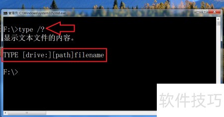 2、 在命令提示符中输入 type /? 可查看该命令参数的详细用法。