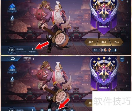 2、 排位赛中先点荣耀记录,再选荣耀战区。