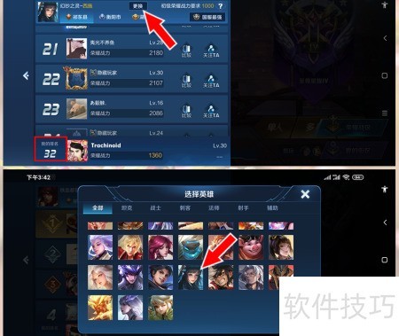 5、 在荣耀榜中点击更换,选择目标英雄,查看其排名,确认是否进入50强或100强。